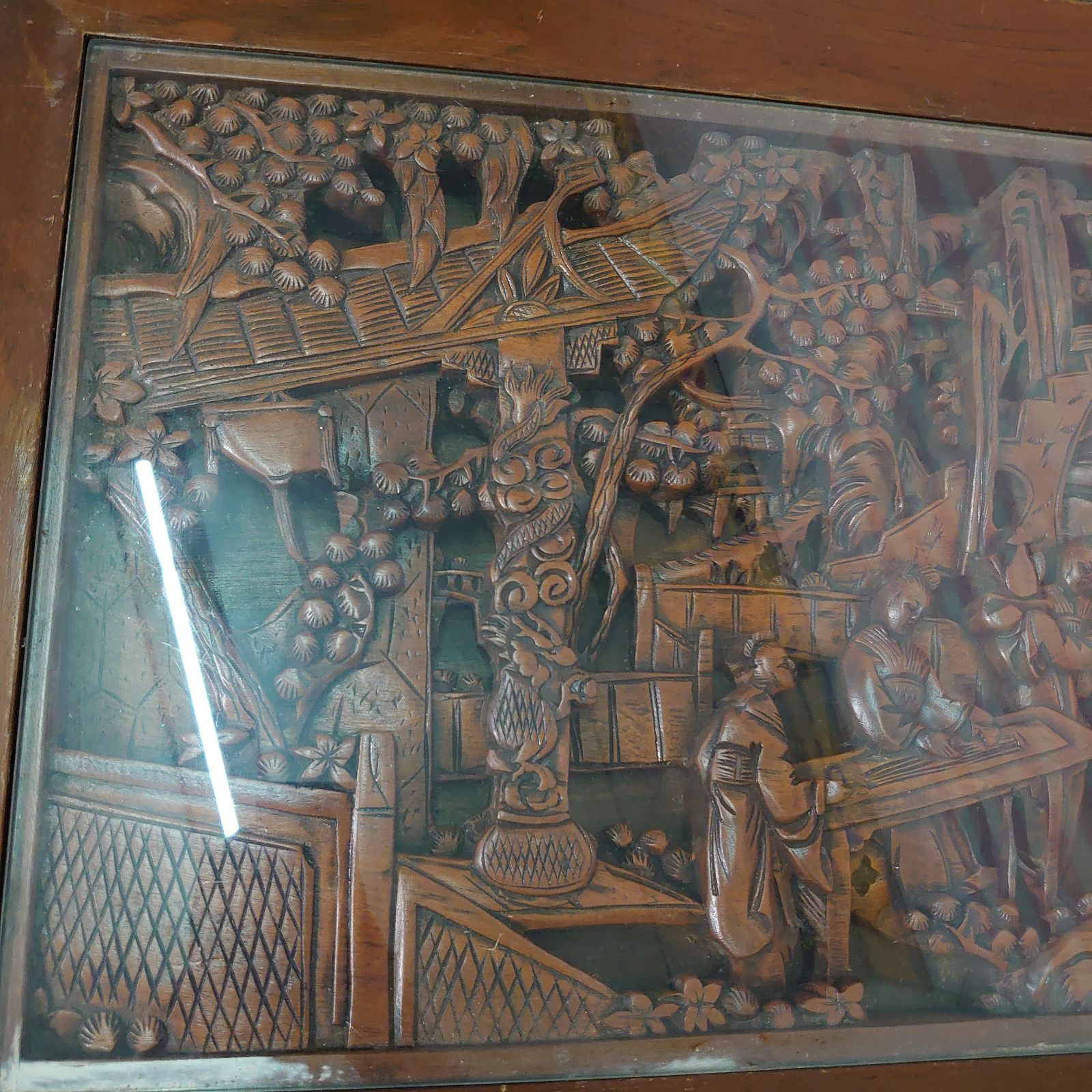- 机・テーブル > センターテーブル・ローテーブル > 【稀少美品】アンティーク 木彫り ガラス ローテーブル 昭和レトロ 希少 ローテーブル センター テーブル 木彫り 彫刻 ガラス